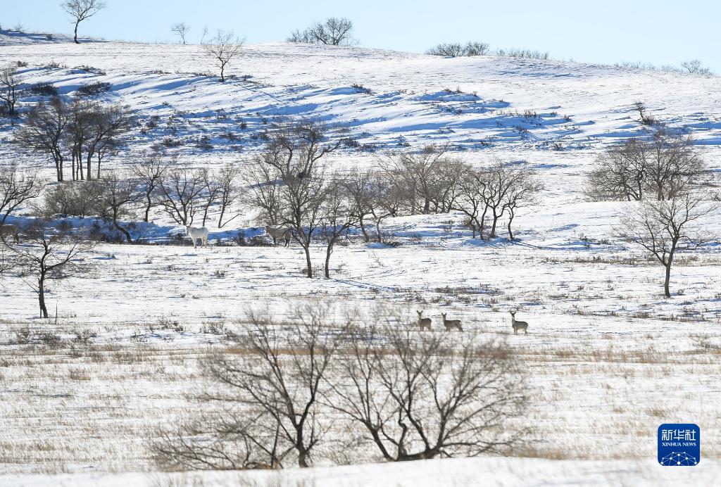 寒冬時節,內蒙古錫林郭勒盟西烏珠穆沁旗的草原銀裝素裹,樹木點綴其間,動物悠閑覓食,一派美麗的冬日景象。