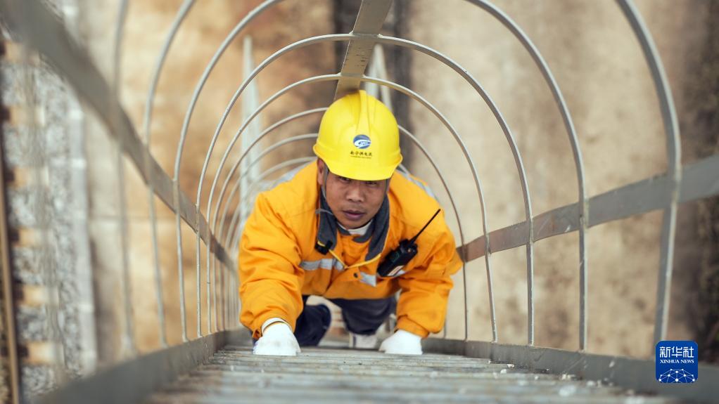 1月9日,中國鐵路南寧局集團有限公司南寧動車所的一名接觸網工爬上燈橋,準備開展檢修工作。