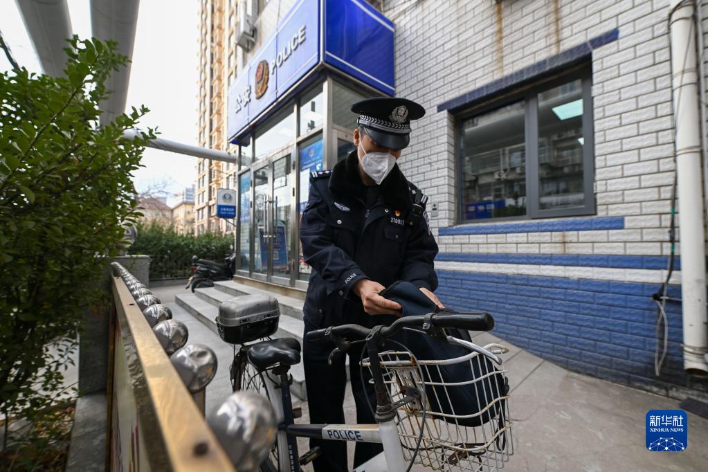 1月7日,在寧園街派出所,陳炳云準備騎自行車前往社區。