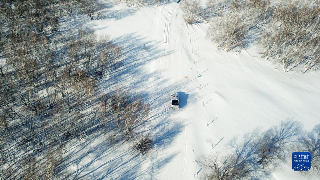 1月9日,西烏珠穆沁旗公安局古日格斯臺國家級自然保護區迪彥派出所民警駕駛警車在林區巡邏(無人機照片)。