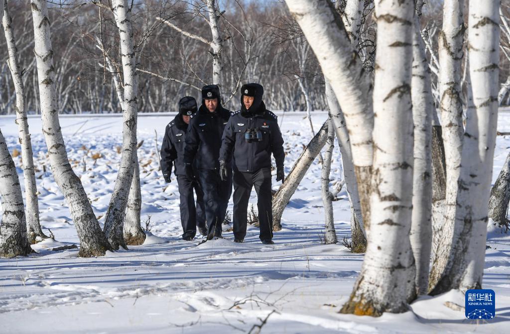1月9日,西烏珠穆沁旗公安局古日格斯臺國家級自然保護區迪彥派出所民警劉士利(右)、呼德格琴(中)和王東濤(左)在林區徒步巡邏。