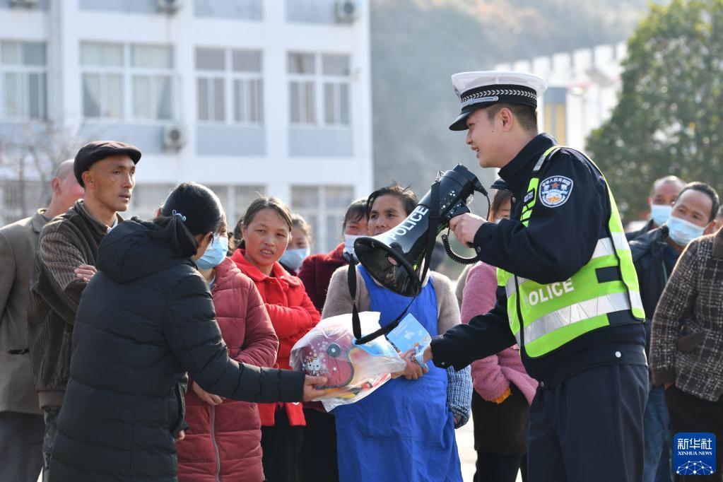 1月10日,在貴州省黔東南苗族侗族自治州舊州鎮冷水河社區,縣交警大隊民警開展交通安全普法宣傳。