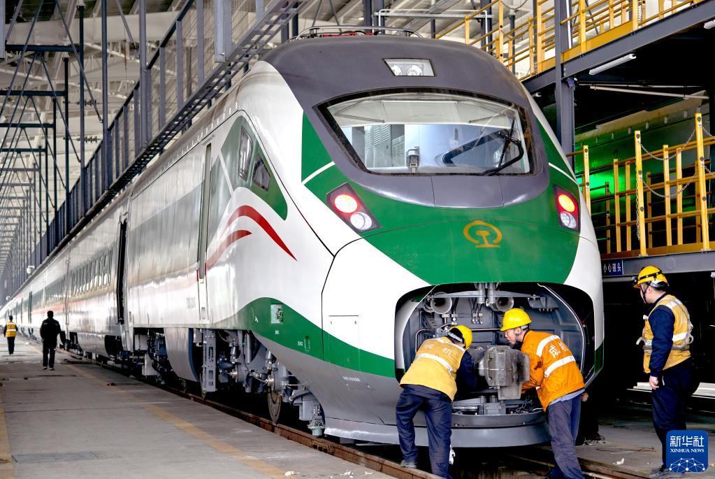 1月9日,在雙流客車技術整備所,檢修人員對新成昆鐵路“復興號”集中動力動車組進行整備,新配置的9組動車組將于1月13日上線運行。