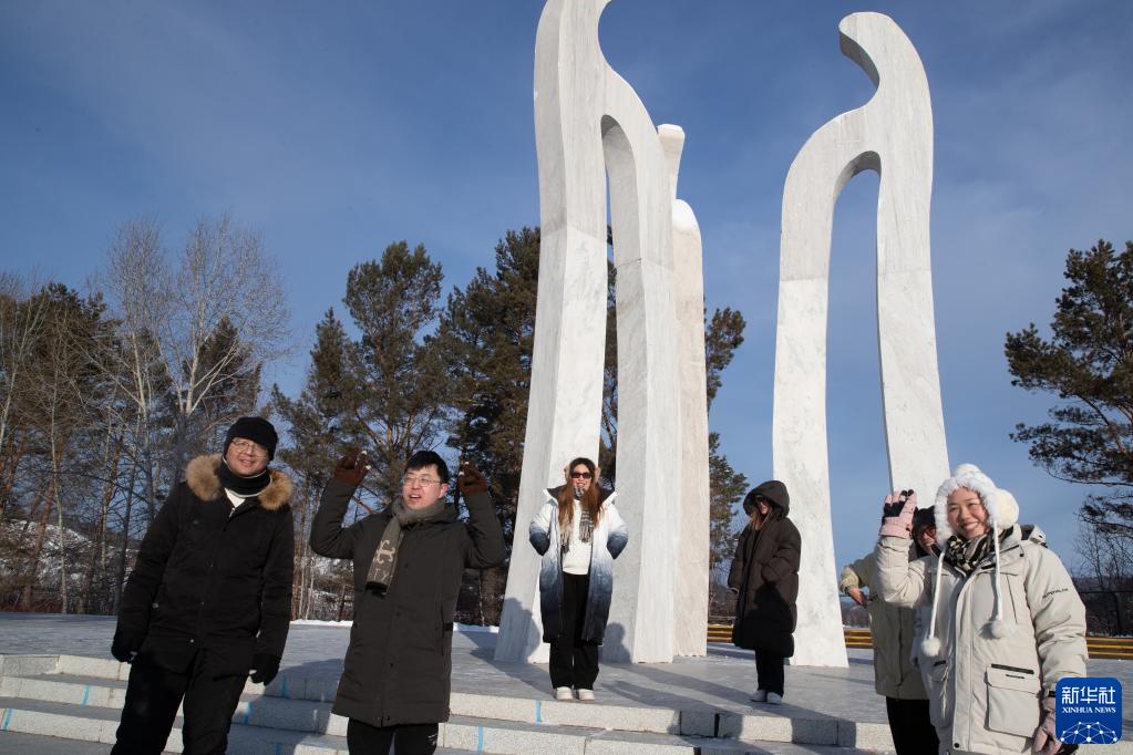 1月10日,游客在漠河市北極村北字廣場游玩。