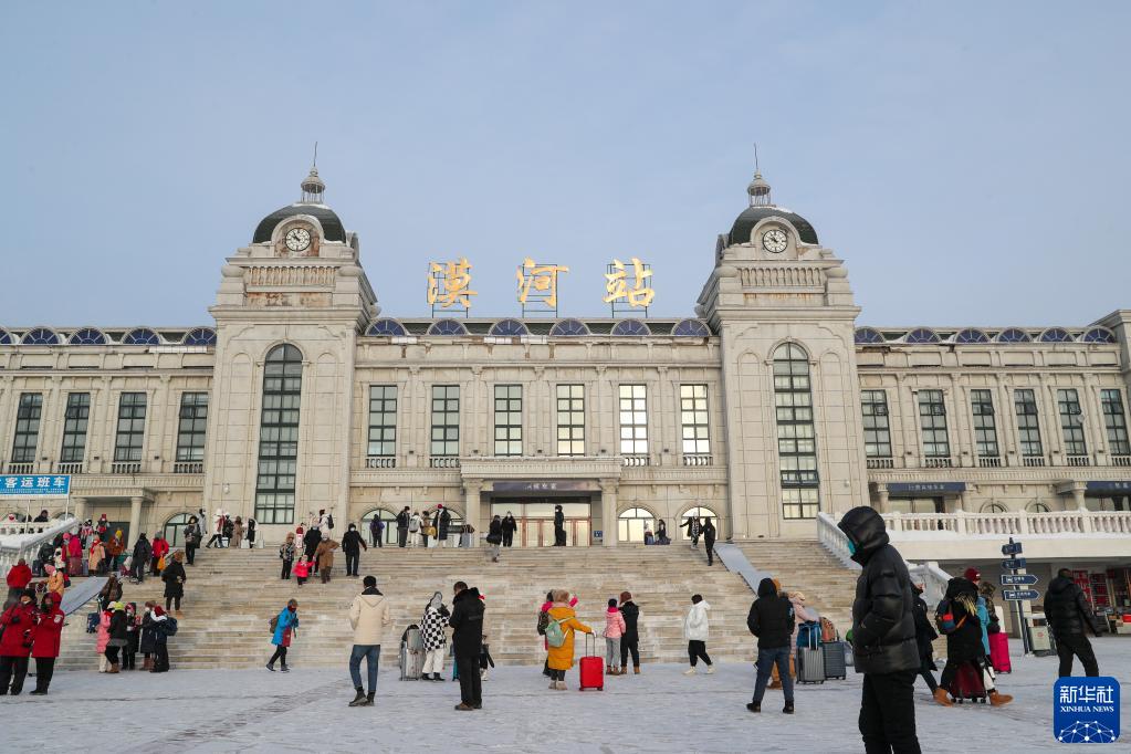 1月7日,出站的游客在漠河火車站外拍照留念。