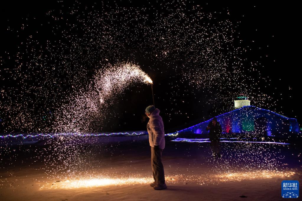1月7日,游客在漠河市北極村冰雪童話世界內游玩。