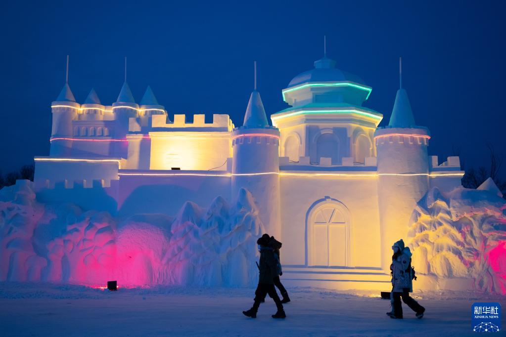 1月7日,游客在漠河市北極村冰雪童話世界內游玩。
