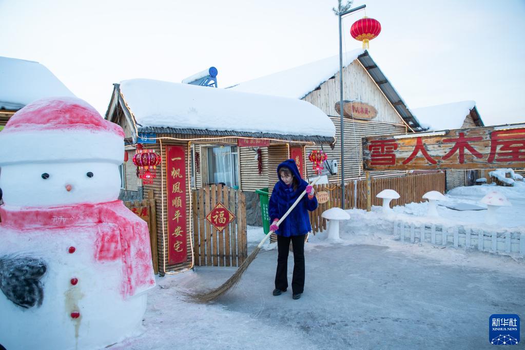 1月7日,漠河市北極村民宿經營者史瑞娟在打掃門前衛生。