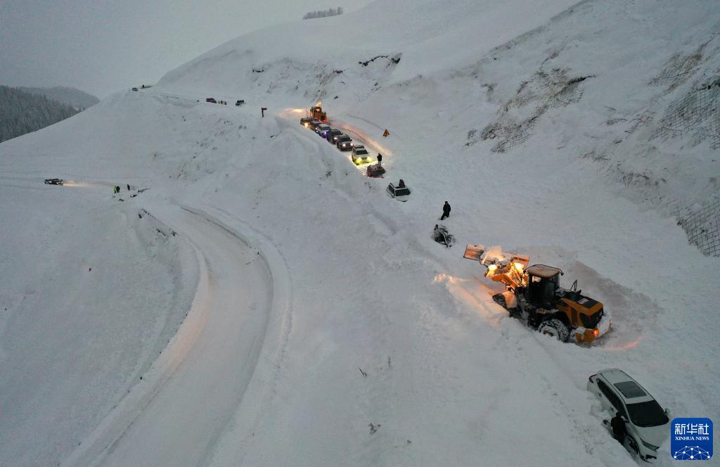 這是在距新疆阿勒泰地區禾木村約45公里處拍攝的一處風雪救援現場(1月8日攝,無人機照片)。新華社記者 胡虎虎 攝
