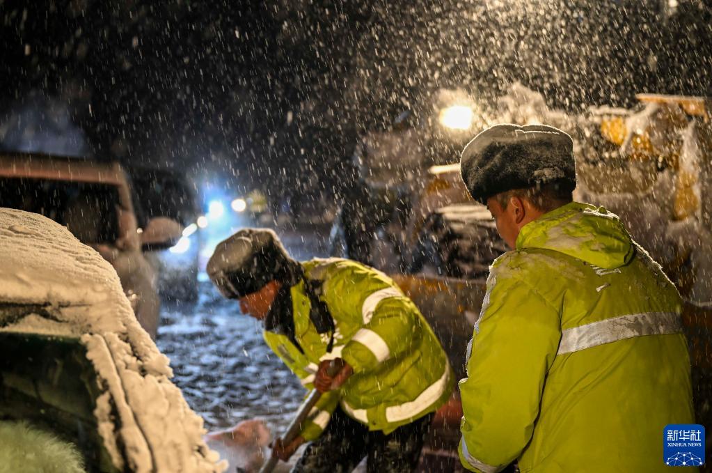 新疆喀納斯景區公安局交警大隊民警在救援現場工作(1月8日攝)。新華社記者 胡虎虎 攝