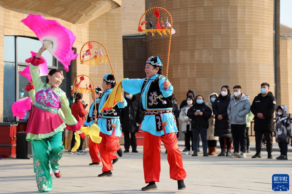 1月10日,石家莊市井陘縣莊旺拉花隊演員在井陘縣南橫口村表演井陘拉花。