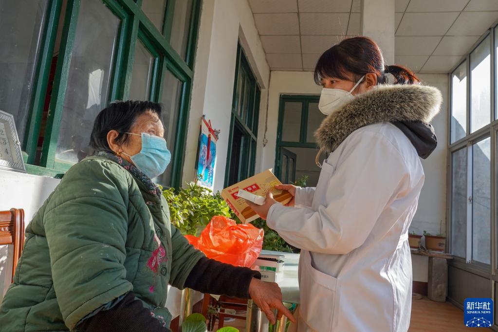 1月10日,山東省濟南市長清區大崮山村衛生室全科醫生王玉新上門為76歲的王好美老人發放藥品。