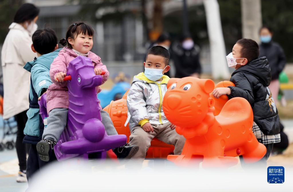 1月10日,孩子們在合肥市瑤海區一處街頭游園內嬉戲。