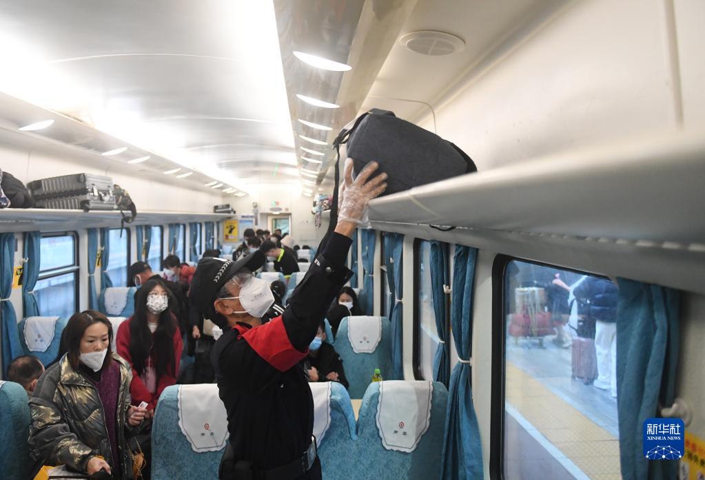 1月10日,覃業民幫旅客將行李放到行李架上。