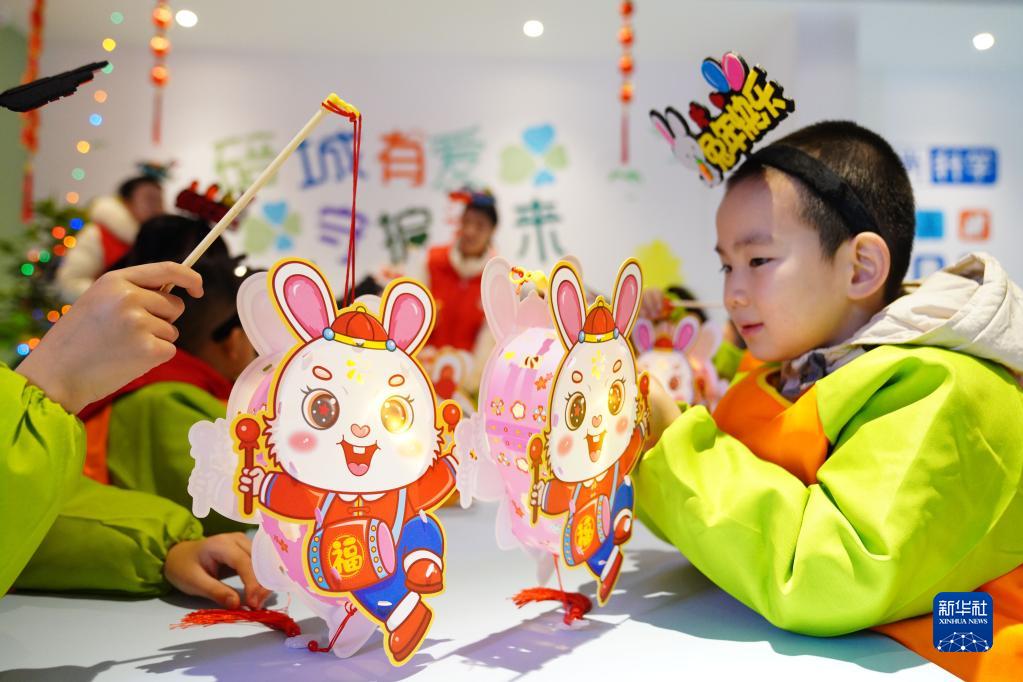 1月10日,在重慶市北碚區未成年人保護中心,孩子們在組裝玉兔造型的手工燈籠。