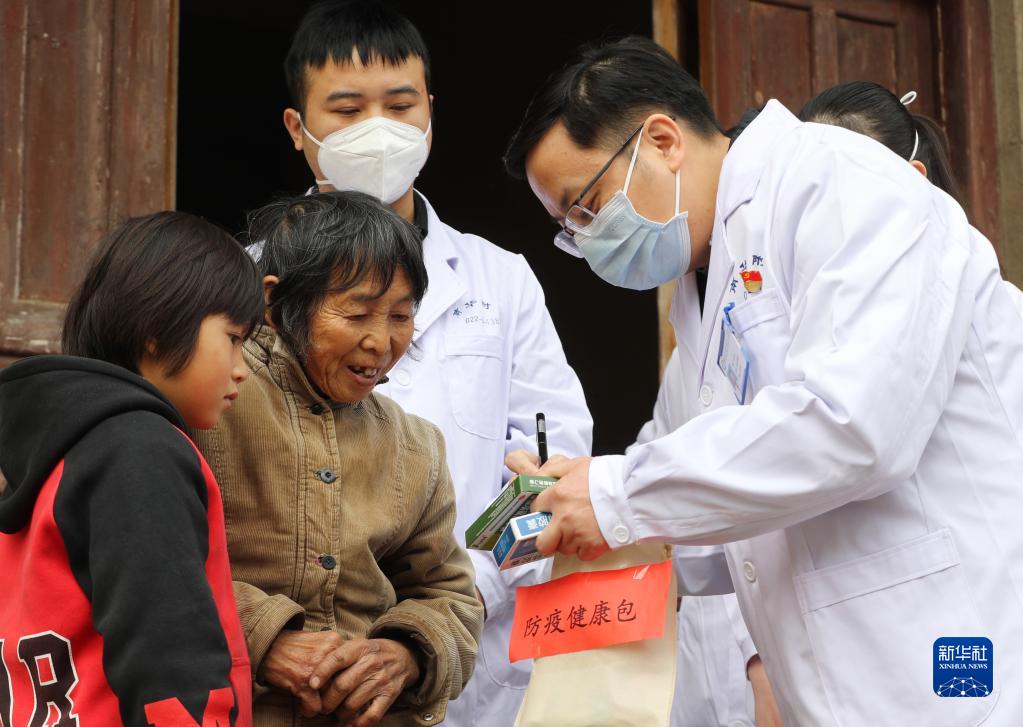 1月10日,在郴州市安仁縣渡口鄉長灘村,來自南華大學第一臨床學院的志愿者給當地村民送上健康包并指導用藥。