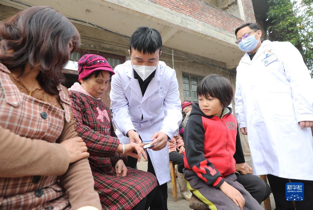 1月10日,在郴州市安仁縣渡口鄉長灘村,來自南華大學第一臨床學院的研究生志愿者給當地村民進行血氧飽和度的檢查。