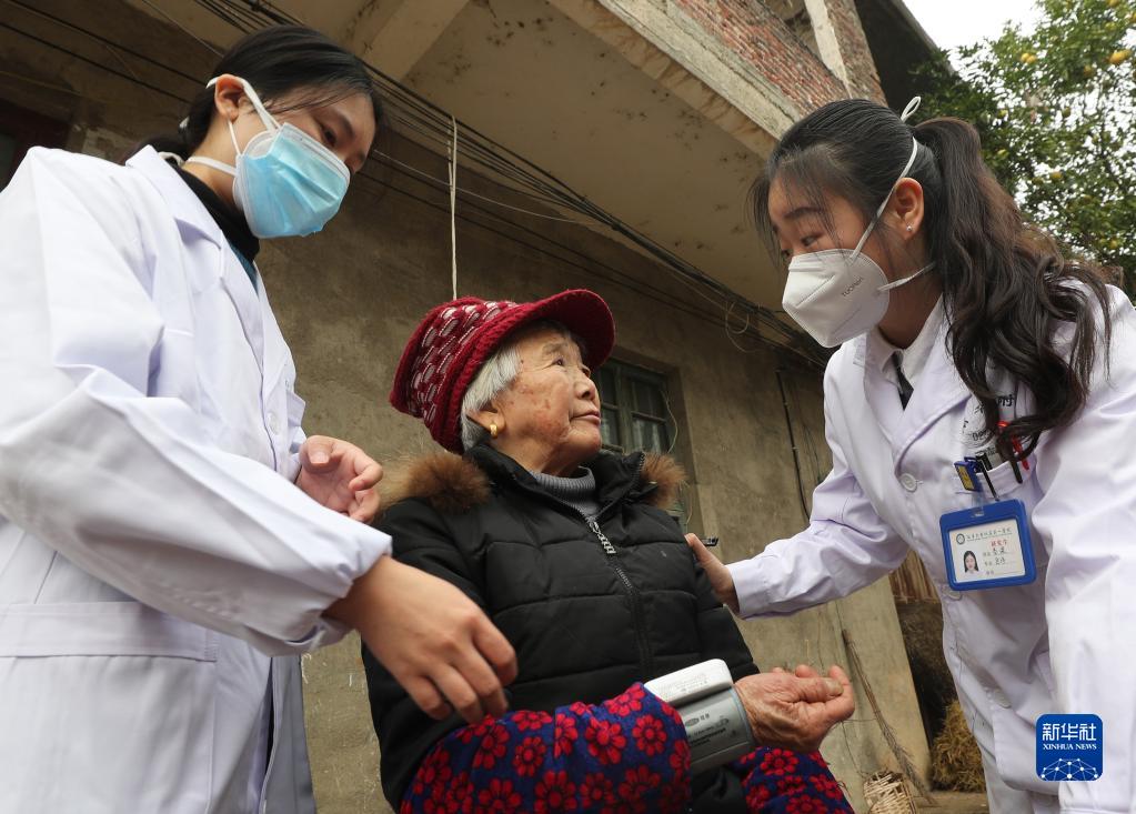 1月10日,在郴州市安仁縣渡口鄉長灘村,來自南華大學第一臨床學院的研究生志愿者給當地村民測量血壓。
