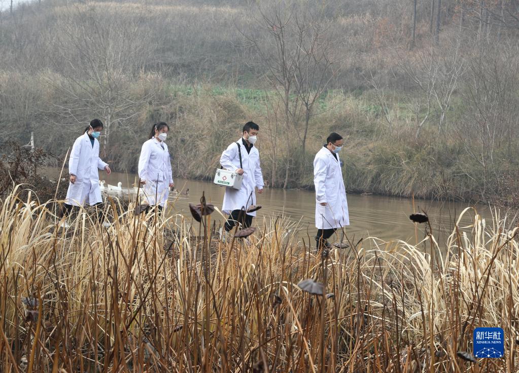 1月10日,在郴州市安仁縣渡口鄉長灘村,南華大學第一臨床學院的研究生志愿者走在送醫送藥的路上。