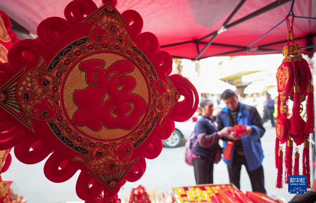 1月10日,人們在貴州省黔東南苗族侗族自治州丹寨縣年貨市場選購春節飾品。