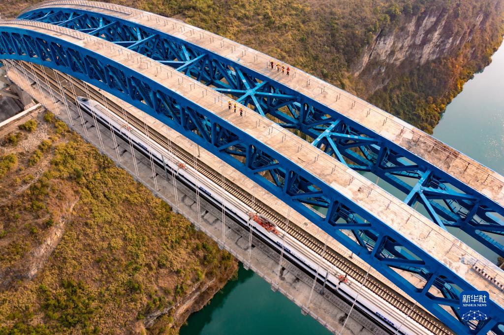 成貴高鐵鴨池河特大橋橫跨貴州省黔西市境內的鴨池河,在地勢險峻的峽谷間,每天約有100多組春運動車穿行經過。在最高處距離河面約277米的大橋上,鐵路職工堅守崗位,嚴格巡檢,對大橋的鋼結構、供電設備、橋梁支座、外包混凝土等進行細致檢查,根據列車運行情況調整軌道線路的幾何尺寸、進行鋼軌探傷等作業,全力保障春運期間動車組安全通過。