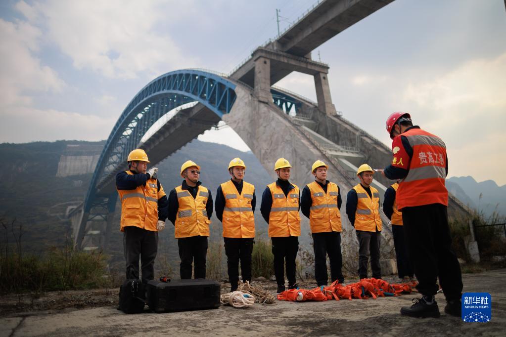 成貴高鐵鴨池河特大橋橫跨貴州省黔西市境內的鴨池河,在地勢險峻的峽谷間,每天約有100多組春運動車穿行經過。在最高處距離河面約277米的大橋上,鐵路職工堅守崗位,嚴格巡檢,對大橋的鋼結構、供電設備、橋梁支座、外包混凝土等進行細致檢查,根據列車運行情況調整軌道線路的幾何尺寸、進行鋼軌探傷等作業,全力保障春運期間動車組安全通過。