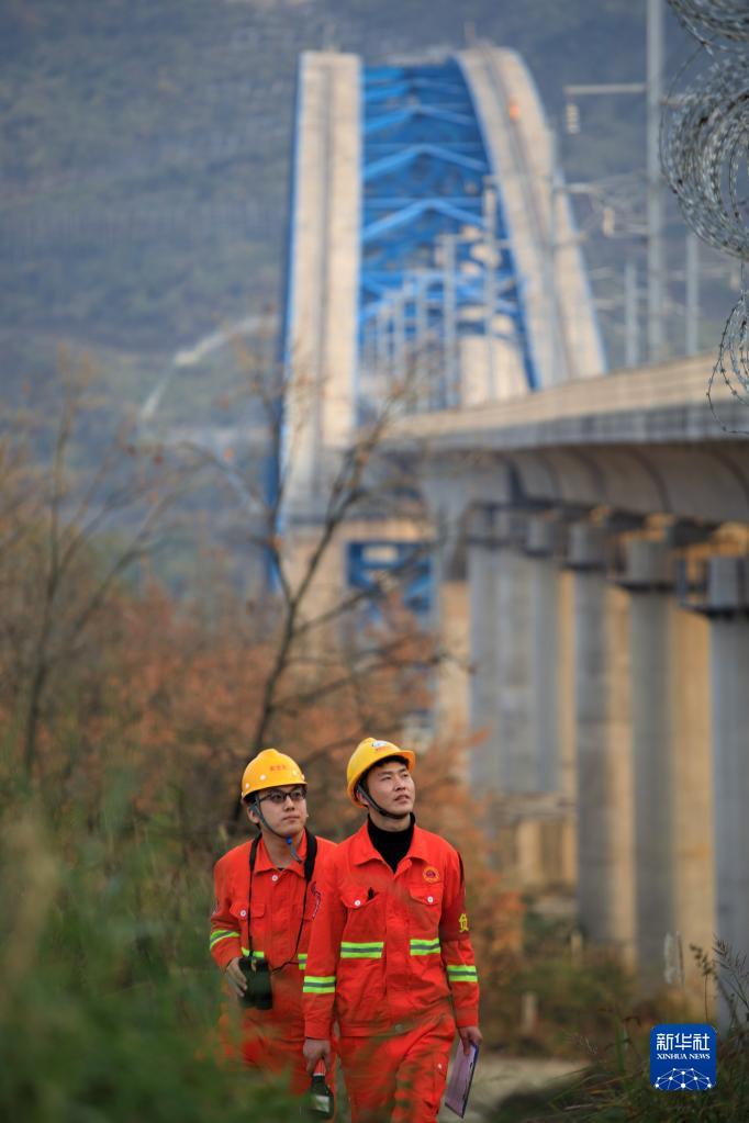成貴高鐵鴨池河特大橋橫跨貴州省黔西市境內的鴨池河,在地勢險峻的峽谷間,每天約有100多組春運動車穿行經過。在最高處距離河面約277米的大橋上,鐵路職工堅守崗位,嚴格巡檢,對大橋的鋼結構、供電設備、橋梁支座、外包混凝土等進行細致檢查,根據列車運行情況調整軌道線路的幾何尺寸、進行鋼軌探傷等作業,全力保障春運期間動車組安全通過。