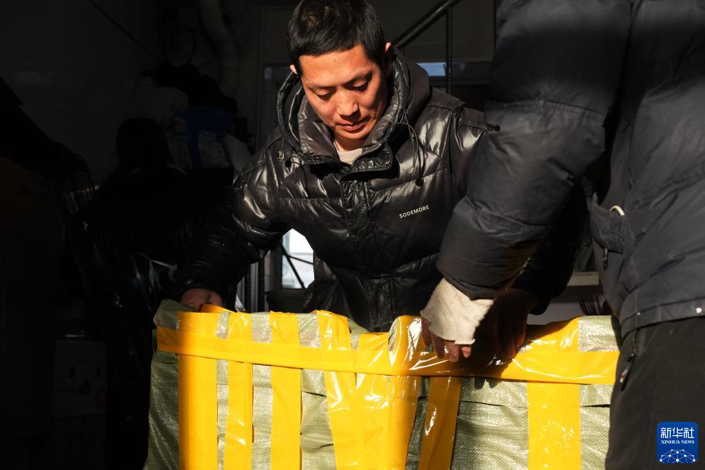 1月10日,東極魚市里小張魚行的老板張云浩在打包魚品準備發貨。