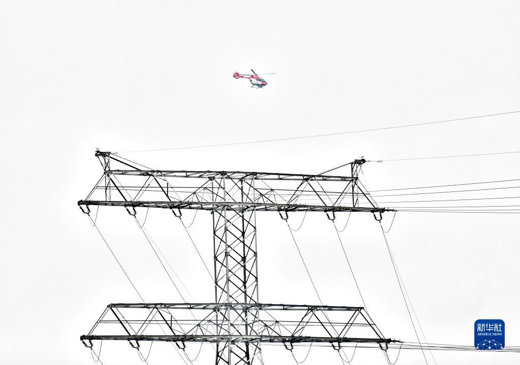 1月9日,在德國柏林,一架直升機飛過高壓電網。