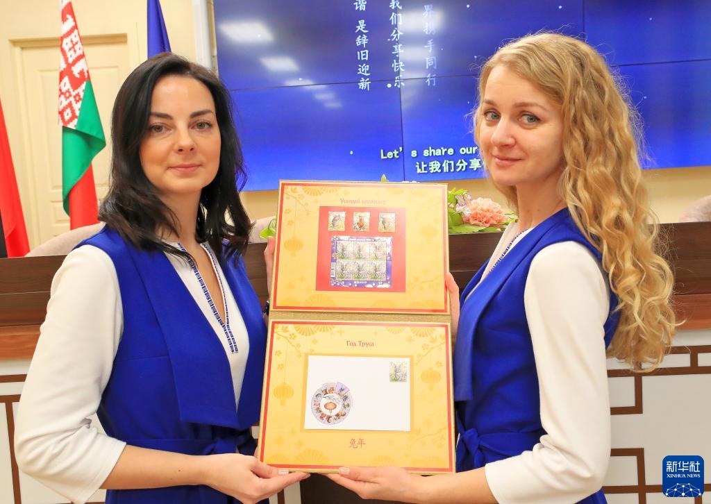 1月10日,在白俄羅斯明斯克,工作人員展示白俄羅斯通信與信息化部發行的中國兔年郵票和首日封。