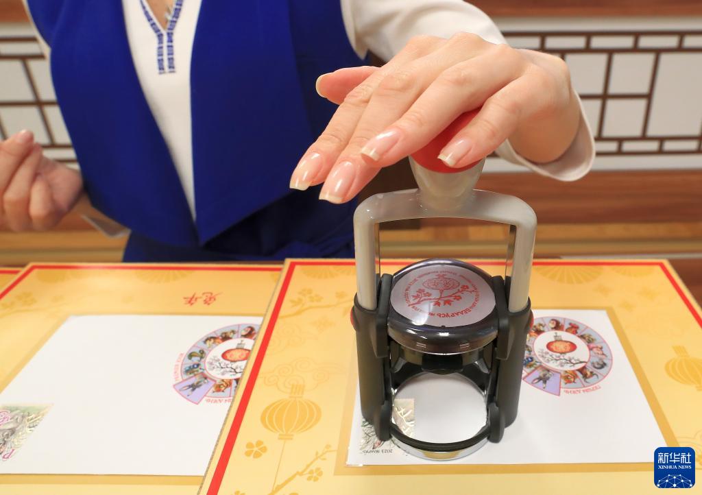 1月10日,在白俄羅斯明斯克,工作人員在白俄羅斯通信與信息化部發行的中國兔年首日封上蓋戳。