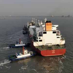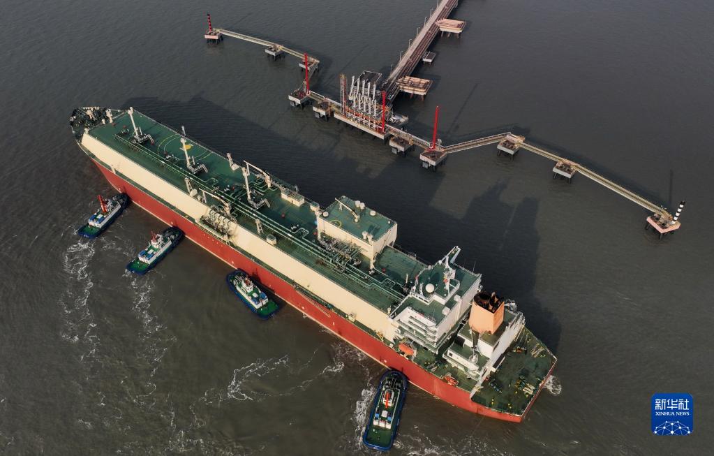 1月11日,一艘LNG船在拖輪的協助下向唐山港曹妃甸港區中石油液化天然氣接收站碼頭靠泊(無人機照片)。