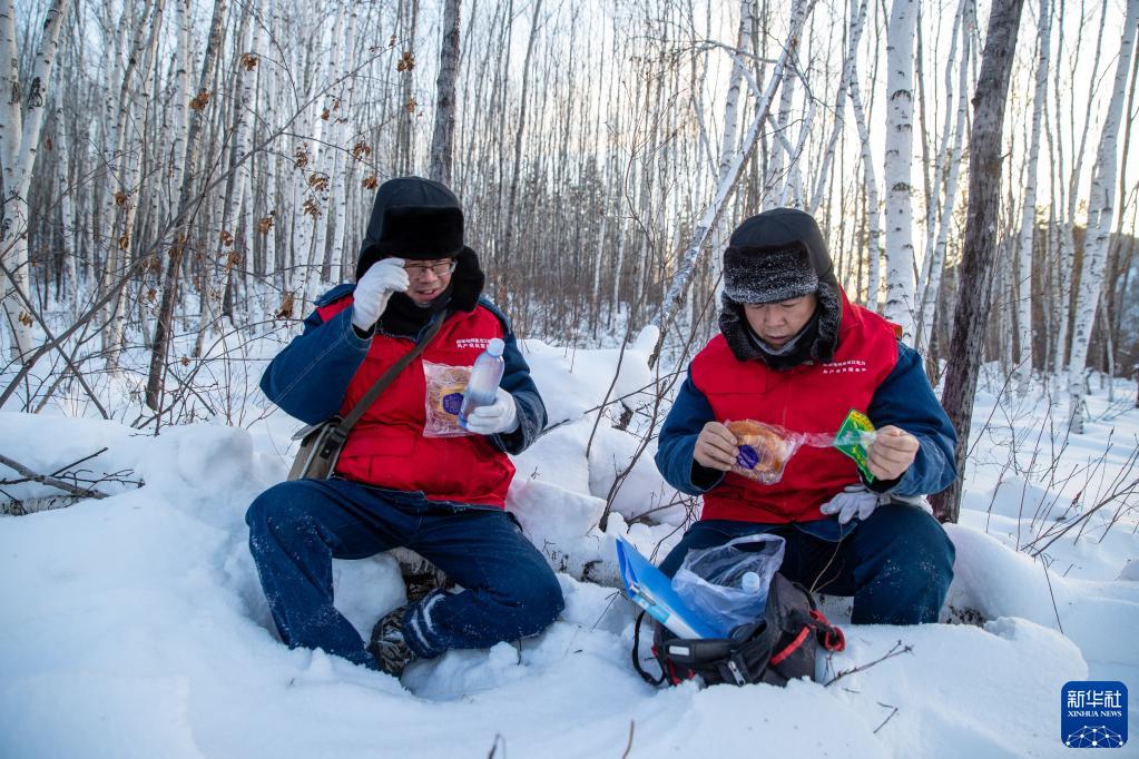 1月9日,線路設備運維人員馬國軍(右)和代洪濱在巡查間隙吃飯休息。新華社記者 張濤 攝