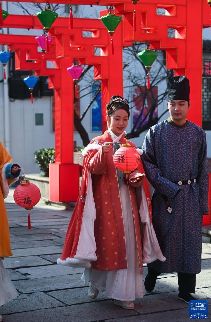 1月11日,人們在杭州市余杭區瓶窯鎮瓶窯老街年貨節上身著傳統服飾體驗傳統民俗。