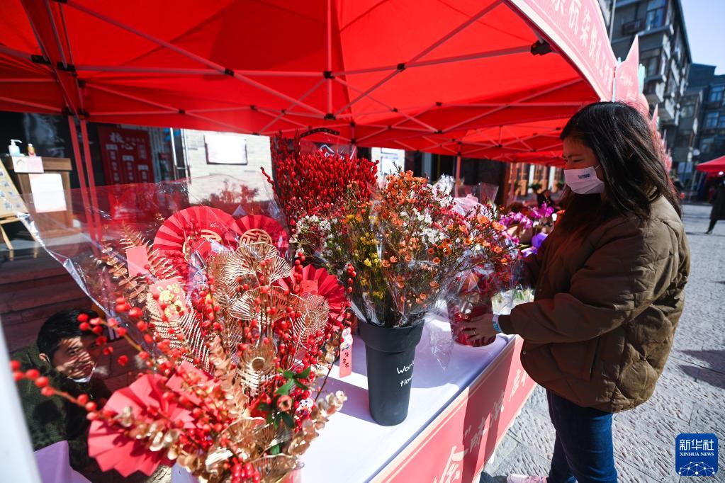 1月11日,人們在杭州市余杭區瓶窯鎮瓶窯老街年貨節上在采購年宵花。