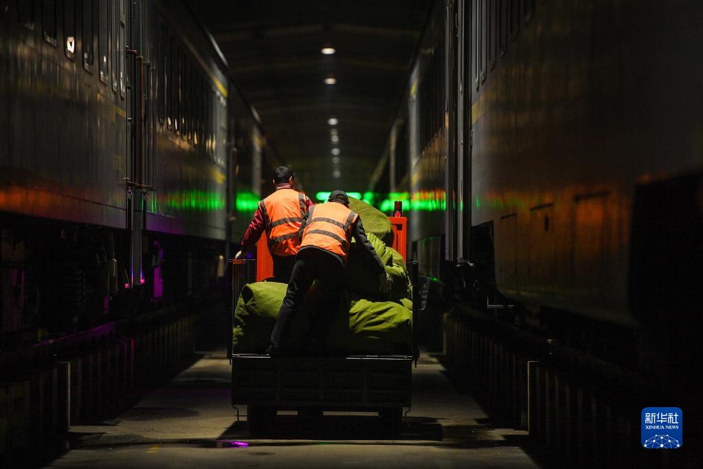 1月10日,工作人員在呼和浩特客運段整備旅服車間收取列車臥具,準備送去清洗。