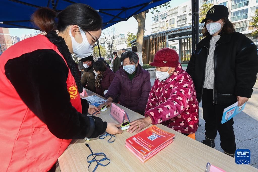 1月11日,在嘉興市南湖區余新鎮幸福社區,衛生院的醫生和志愿者為百姓測血氧并開展健康防護微宣講。