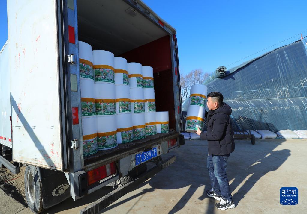 1月9日,在新民市大民屯鎮毓寶臺村,農民裝運包裝好的刺嫩芽盆栽。