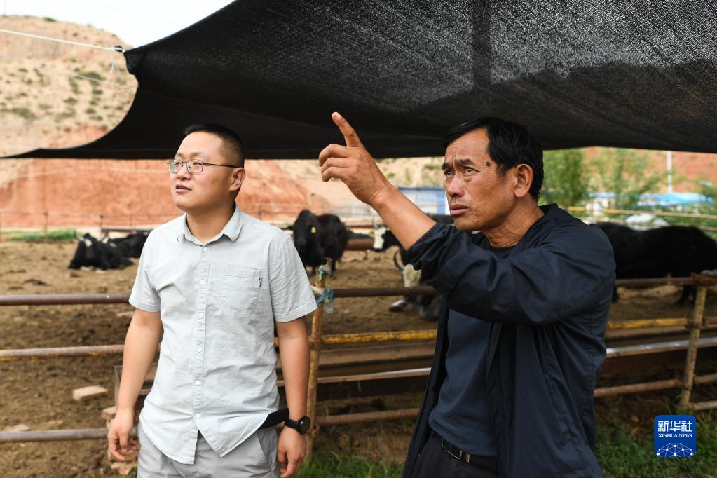 孫海云(右)向技術人員介紹牛圈情況(2021年7月15日攝)。