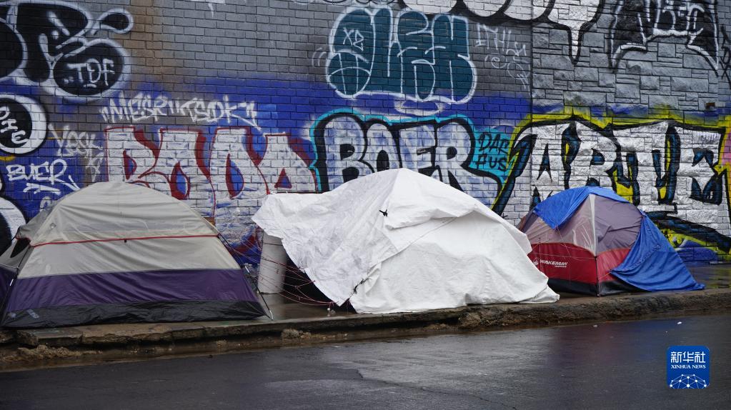 這是1月10日在美國洛杉磯市中心拍攝的無家可歸者的帳篷。