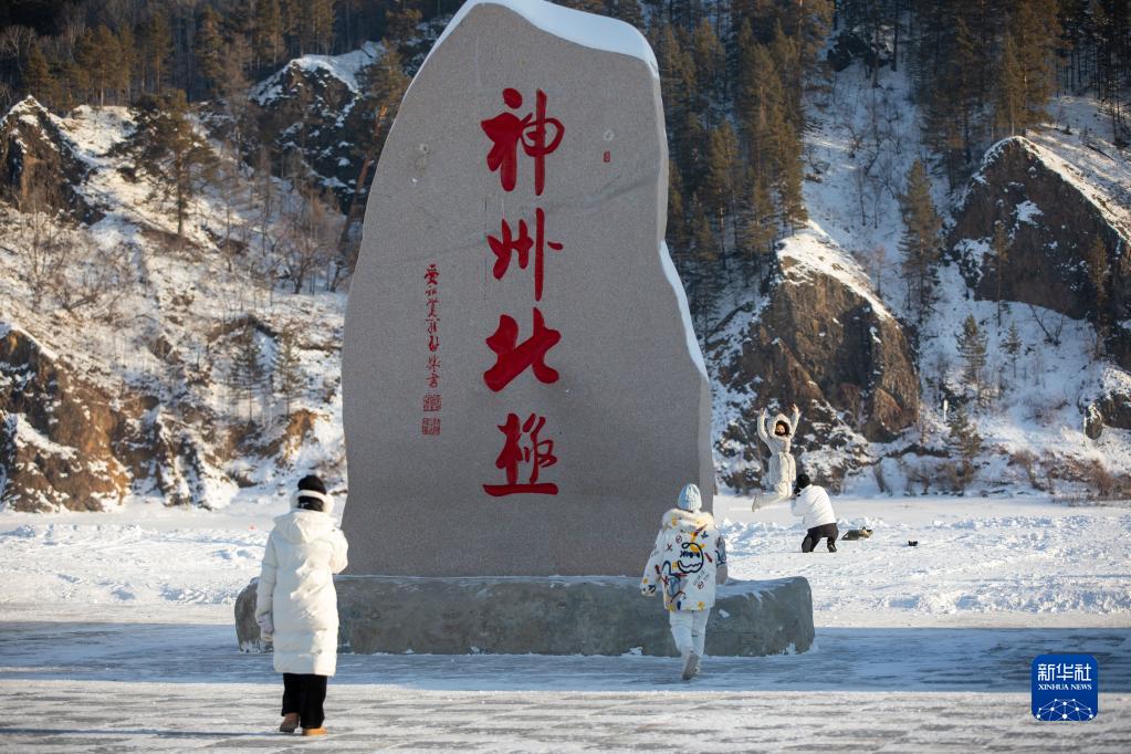 1月10日,在黑龍江省漠河市北極村神州北極廣場,游客拍照留念。