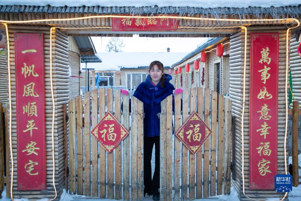 1月7日,北極村民宿經營者史瑞娟在門前等待入住的游客。