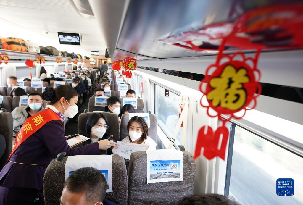 當日,中國鐵路上海局集團有限公司南京客運段高鐵二車隊在D376次列車上開展“回家路上的笑容”繪畫活動,列車員現場為旅客作畫,送上新年祝福。