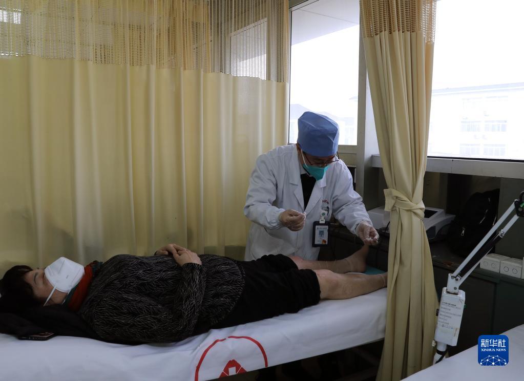 1月10日,青浦區中醫醫院新冠康復中醫門診的醫生為患者針灸。