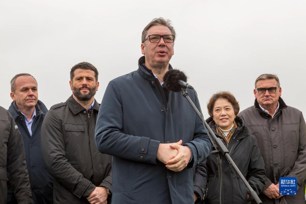 1月11日,塞爾維亞總統武契奇(中)在首都貝爾格萊德視察“新貝爾格萊德-蘇爾欽”高速公路項目施工現場時講話。
