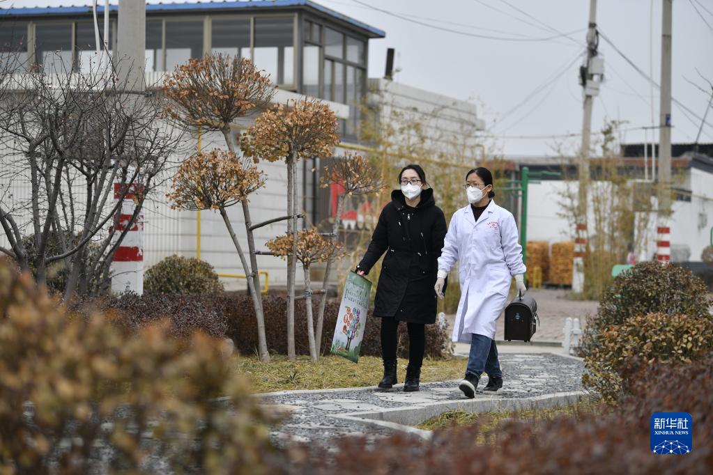 1月11日,河北省唐山市豐南區嶺子上村“農村巡診小分隊”村醫董秀芹(右)和網格員楊順利在巡診途中。