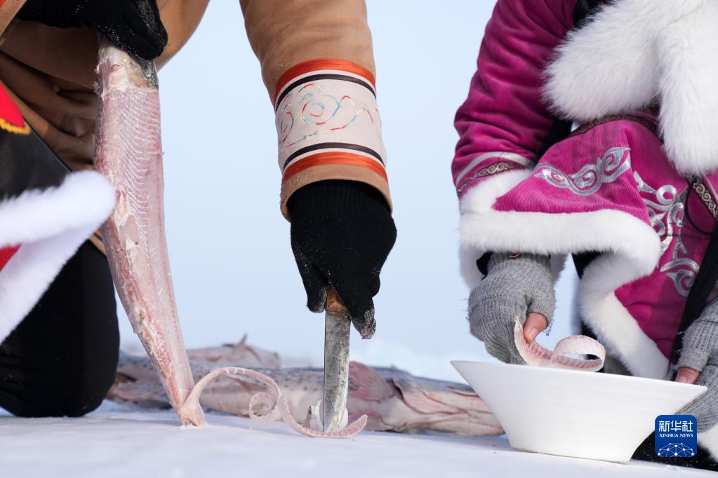 1月11日,在撫遠市東湖,赫哲族群眾把捕上來已經凍硬的魚切片。