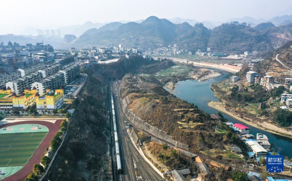 1月11日, 5640次列車從貴州凱里市附近駛過(無人機照片)。