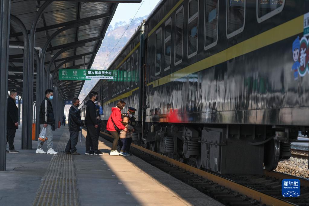 1月10日,旅客在貴州凱里站排隊登上5640次列車出行。