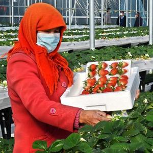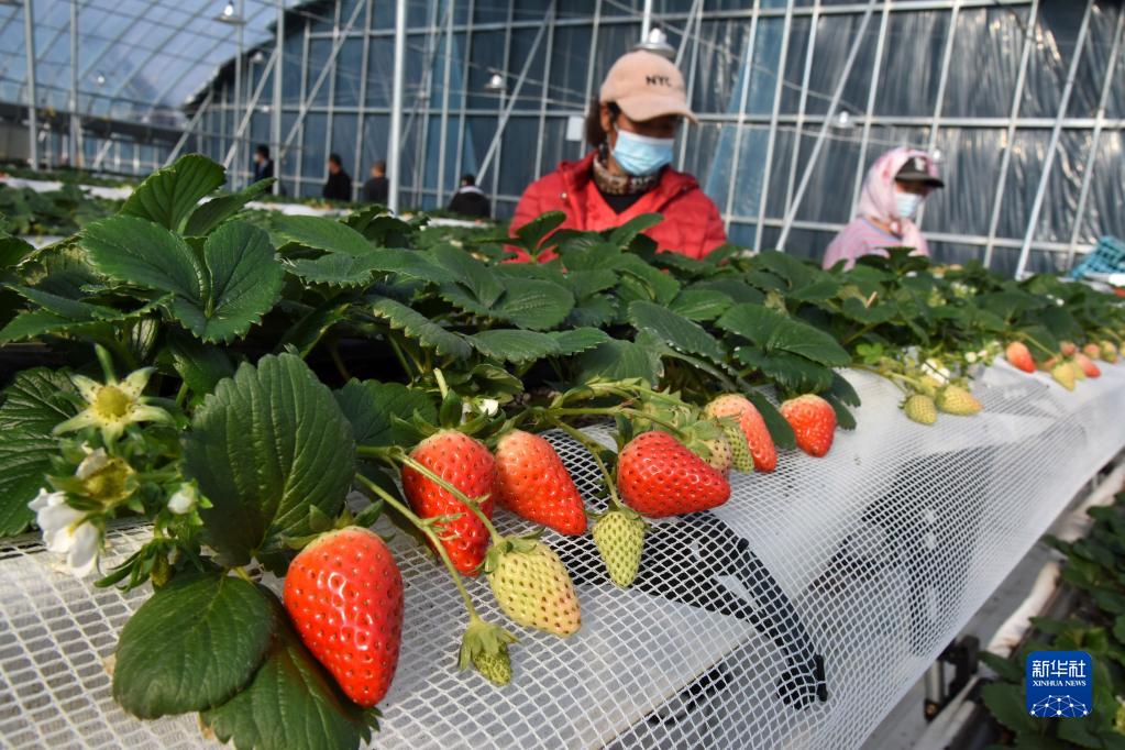 1月11日,山東省平度市舊店鎮東店子村村民在智能溫室采摘草莓。